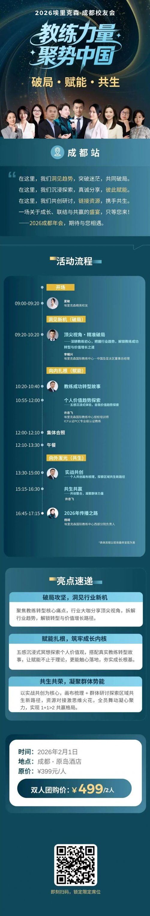 为此,埃里克森国际教练中心诚启2026年度校友会,首站落地成都。成都站我们以“破局·赋能·共生”为核心主题,聚焦“教练+个人商业化”的深度探索,精心打造一场专属于教练群体的成长盛会。